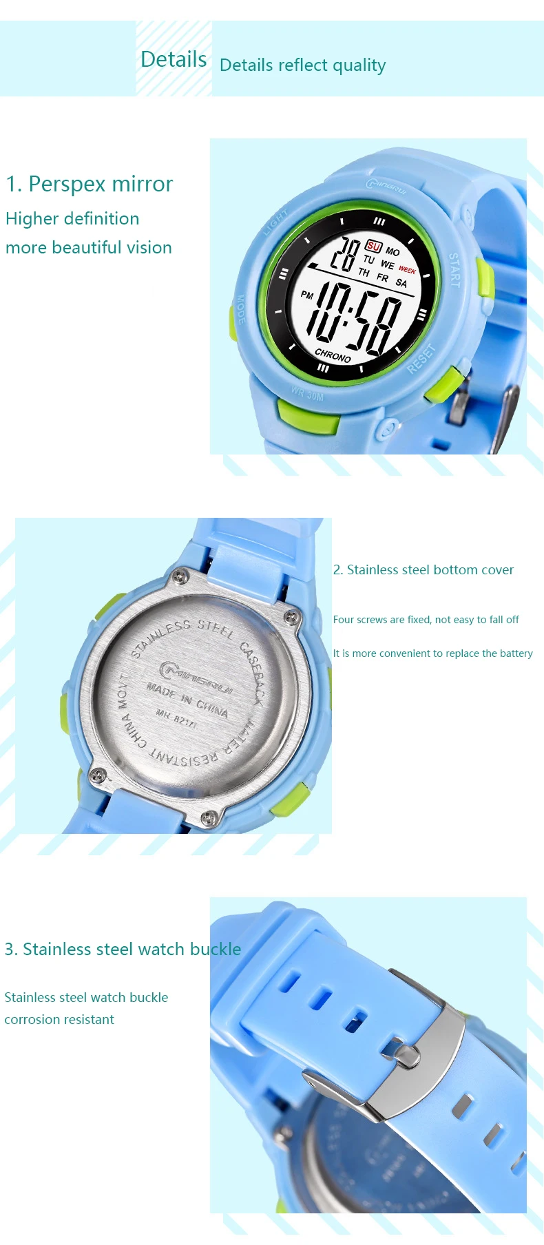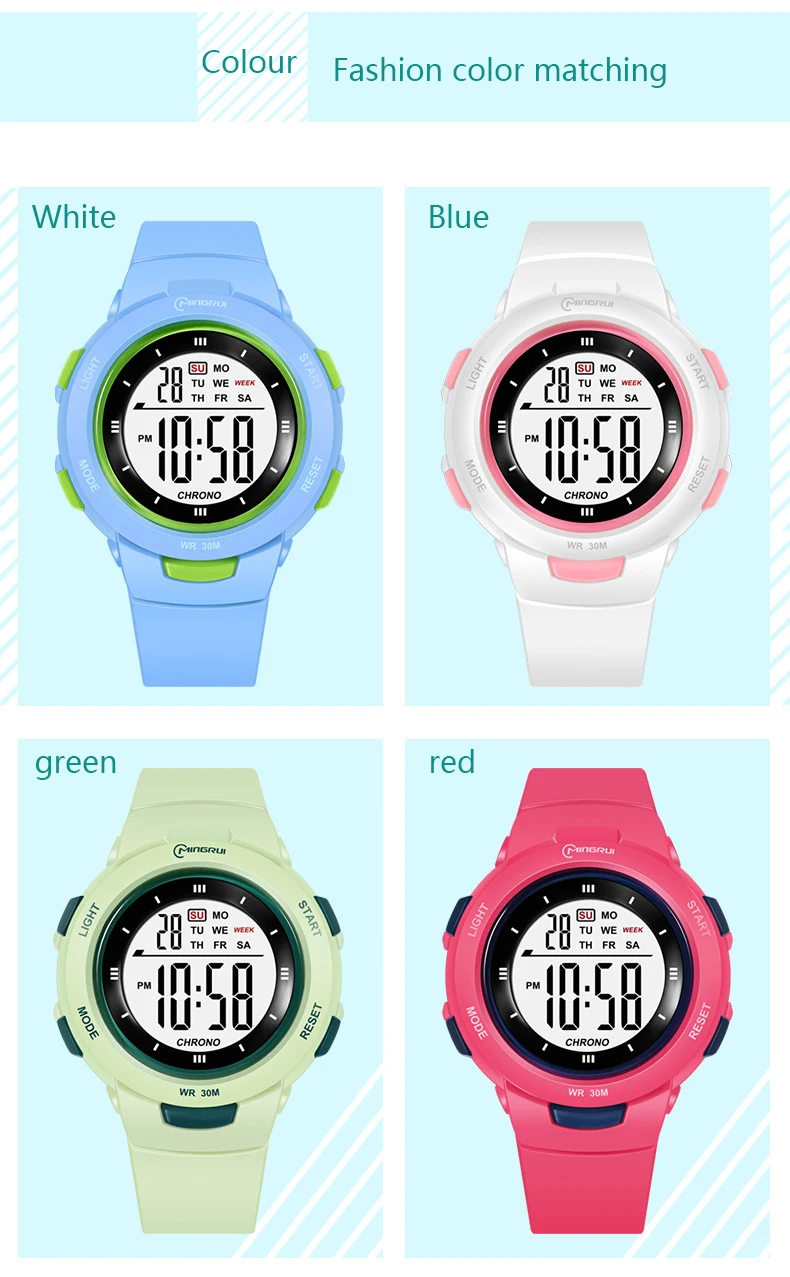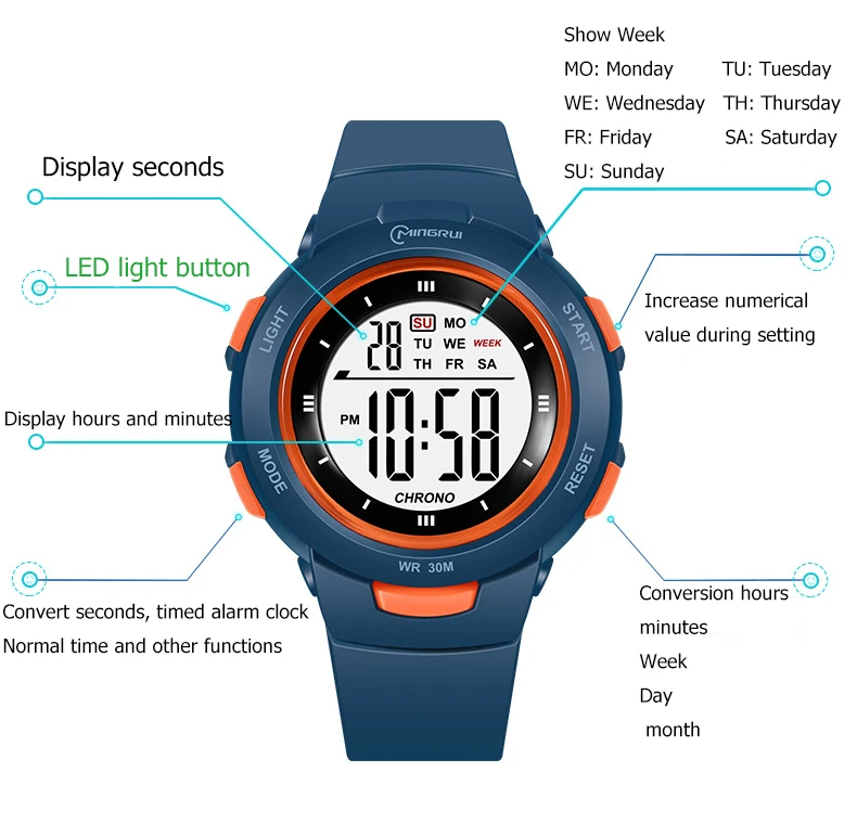 14. Special functions: night light, calendar, week display, waterproof, alarm clock, running time