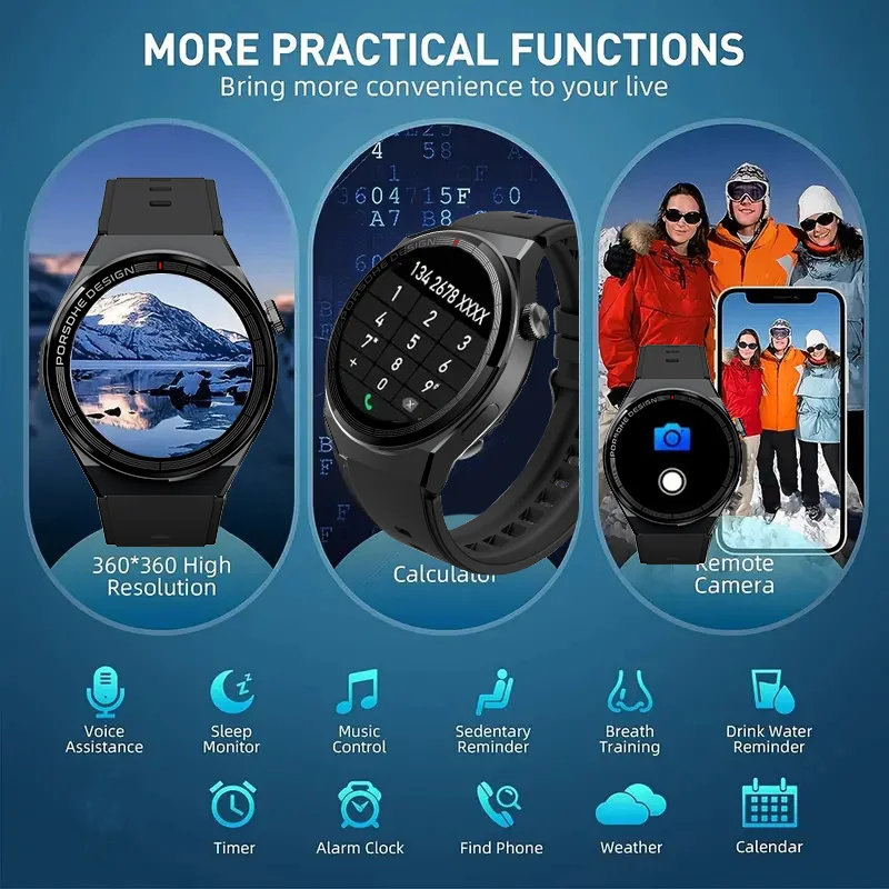 360*360 high resolution/ calculator/ remote camera/ voice assistant/ sleep monitor/ music control/ sedentary reminder/ breath training/drink water reminder/ timer/alarm clock/ find phone/ weather/ calendar