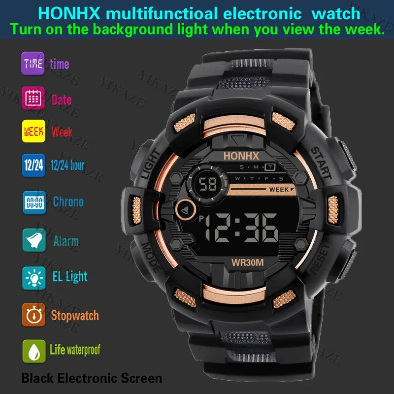 –Multifunction Watch: stopwatch, alarm clock, hourly reminder, luminous, date display, time display, week display, 12/24 hour conversion, waterproof